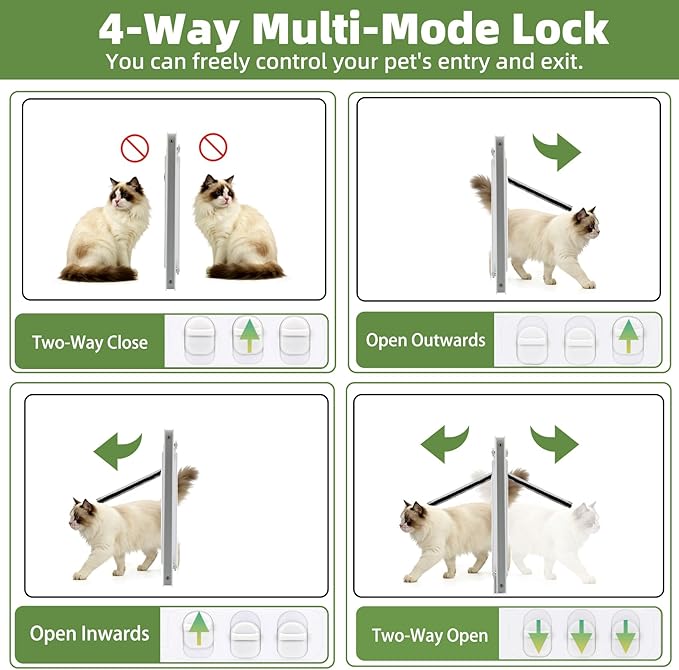 • Multi-Mode Lock: Pet door window for cats features a 4-way locking mechanism: two-way closing, two-way opening, outward opening, and inward opening. You can freely adjust the operating mode of the cat door to ensure that your pet can stay indoors or go outside freely.